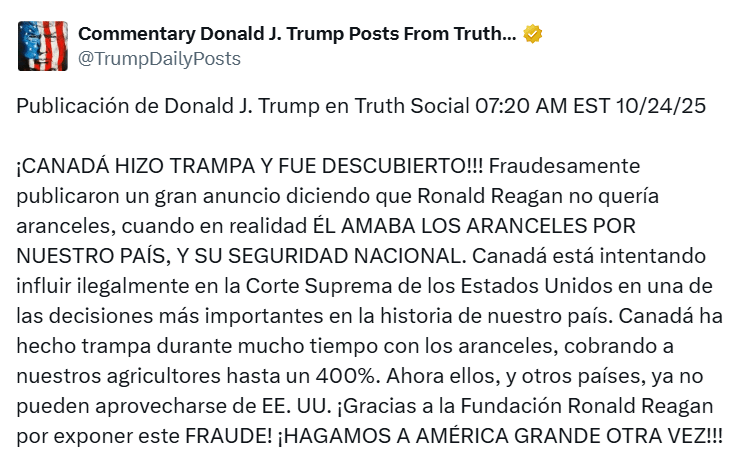 Trump expresó en su mensaje en redes sociales, “Los aranceles son muy importantes para la seguridad nacional y la economía de EE.UU. Basado en su comportamiento atroz, TODAS LAS NEGOCIACIONES COMERCIALES CON CANADÁ QUEDAN POR LA PRESENTE TERMINADAS”.