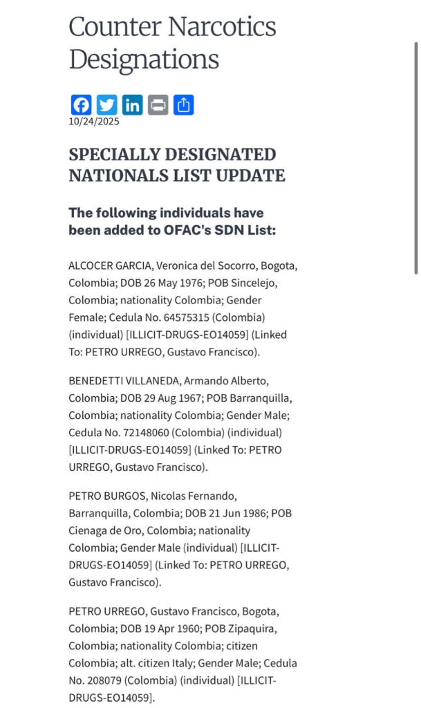 La Oficina de Control de Activos Extranjeros (OFAC) del Departamento del Tesoro de Estados Unidos confirmó este viernes la inclusión del presidente Gustavo Petro, la primera dama Verónica Alcocer, el ministro del Interior Armando Benedetti y Nicolás Petro en la llamada Lista Clinton, un instrumento que identifica a personas y entidades vinculadas con lavado de activos o financiación del narcotráfico.