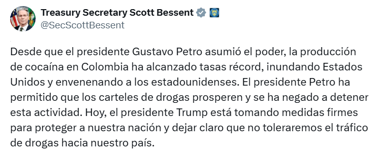 El secretario del Tesoro, Scott Bessent, justificó la decisión asegurando que “desde que Petro llegó al poder, la producción de cocaína en Colombia se ha disparado a niveles históricos”, y lo acusó de “otorgar beneficios a organizaciones narcoterroristas bajo su plan de paz total”.