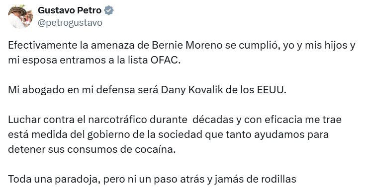 Tras conocerse la sanción, el presidente Gustavo Petro confirmó su inclusión en la lista y calificó la decisión como una “paradoja”. “Luchar contra el narcotráfico durante décadas y con eficacia me trae esta medida del Gobierno de la sociedad que tanto ayudamos para detener sus consumos de cocaína. Toda una paradoja, pero ni un paso atrás y jamás de rodillas«, afirmó el presidente.