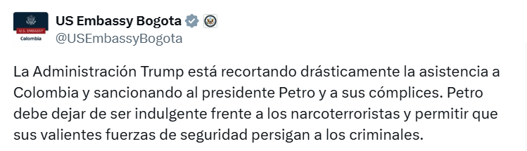 La Embajada advirtió en X que la Administración Trump “está recortando drásticamente la asistencia a Colombia y sancionando al presidente Petro y a sus cómplices”, y pidió que se permita a las fuerzas de seguridad perseguir a los narcoterroristas.