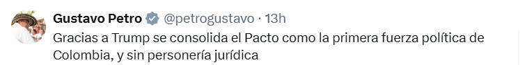 “Gracias a Trump se consolida el Pacto como la primera fuerza política de Colombia, y sin personería jurídica”, escribió Petro en su cuenta de X. La frase fue interpretada como una respuesta directa a las acusaciones del exmandatario estadounidense, quien lo ha calificado públicamente como un “líder del narcotráfico”.