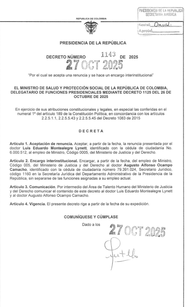 La decisión se oficializó este lunes 27 de octubre mediante el Decreto 1143, firmado por el ministro de Salud, Guillermo Alfonso Jaramillo, quien actúa como delegado presidencial durante el viaje del jefe de Estado a Medio Oriente. Ocampo, conocido por su paso como “zar anticorrupción” durante la administración de Jaramillo en Ibagué, sumará esta responsabilidad sin abandonar su actual cargo en la Presidencia.