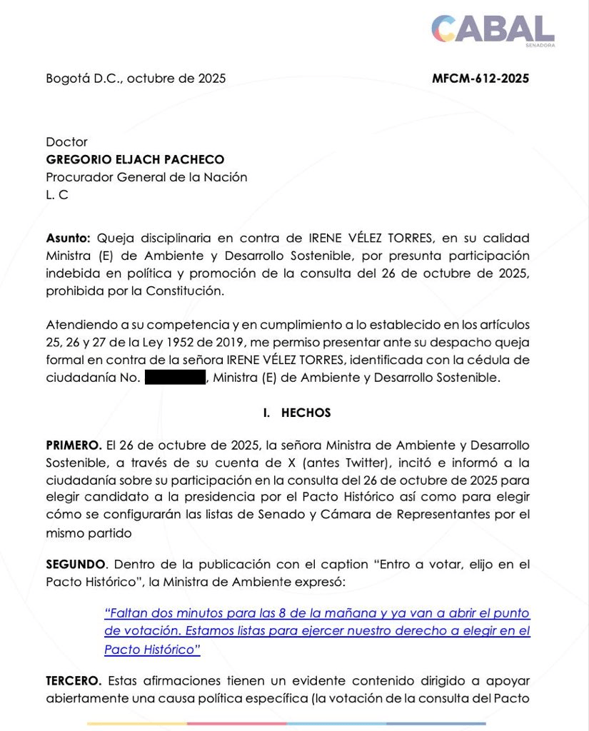 Cabal argumenta que Vélez habría promovido la votación en la consulta del Pacto Histórico del pasado 26 de octubre a través de un video en sus redes sociales, lo que, según la senadora, viola el Código General Disciplinario y la Ley 1952 de 2019.