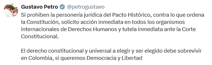 “Si prohíben la personería jurídica del Pacto Histórico, contra lo que ordena la Constitución, solicito acción inmediata en todos los organismos internacionales de Derechos Humanos y tutela inmediata ante la Corte Constitucional”, escribió Petro en su cuenta de X.