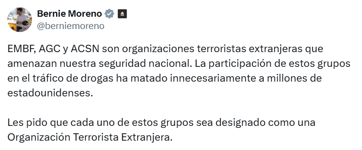 En una carta dirigida al secretario de Estado, Marco Rubio, Moreno argumentó que estas estructuras “participan activamente en actividades terroristas y representan una amenaza directa para la seguridad de Estados Unidos”. Según explicó, los grupos señalados tienen un historial de asesinatos, ataques armados, narcotráfico y campañas de intimidación que “encajan plenamente en la definición legal de terrorismo según la legislación estadounidense”.