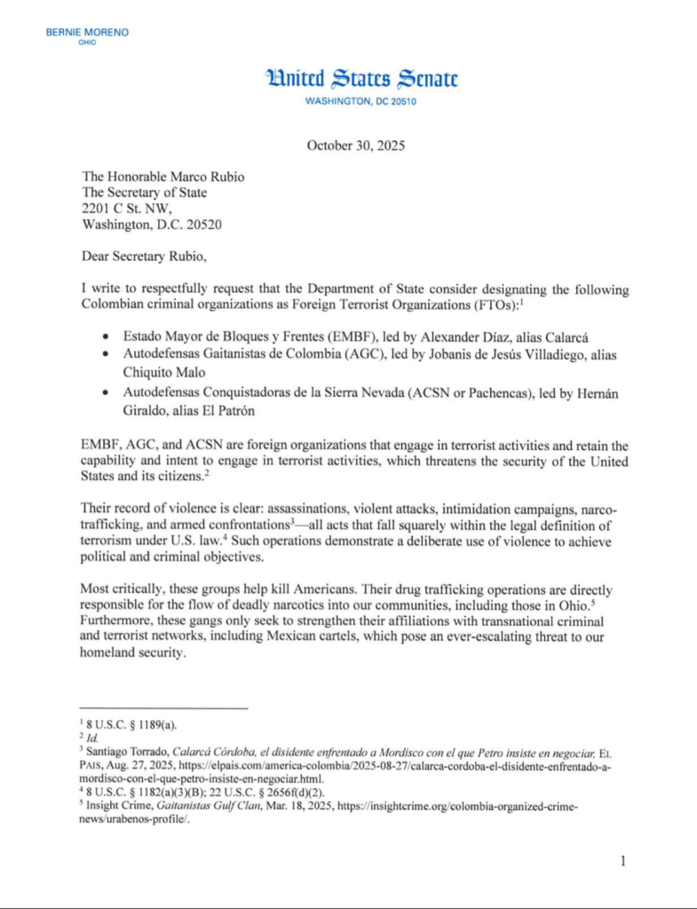 El senador republicano Bernie Moreno pidió al Departamento de Estado de Estados Unidos incluir en la lista de organizaciones terroristas extranjeras (FTO) a las disidencias de las FARC, las Autodefensas Gaitanistas de Colombia (AGC) y las Autodefensas Conquistadoras de la Sierra Nevada (ACSN), conocidas como los Pachencas.