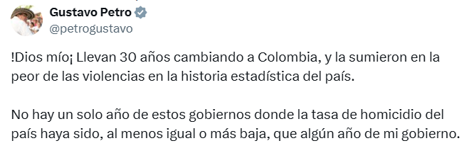 El presidente Gustavo Petro reaccionó rápidamente al anuncio del encuentro, cuestionando el historial de ambos expresidentes. “¡Dios mío! Llevan 30 años cambiando a Colombia y la sumieron en la peor de las violencias en la historia estadística del país. No hay un solo año de esos gobiernos donde la tasa de homicidio haya sido igual o más baja que en alguno de mi mandato”, escribió en X.