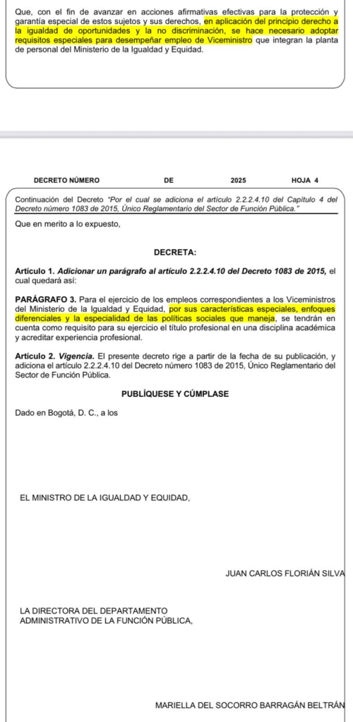El Gobierno Nacional volvió a publicar un borrador de decreto con el que busca modificar los requisitos exigidos para ser viceministro del Ministerio de la Igualdad y Equidad, una medida que reaviva la controversia por el posible nombramiento de Juliana Guerrero en el viceministerio de Juventudes.