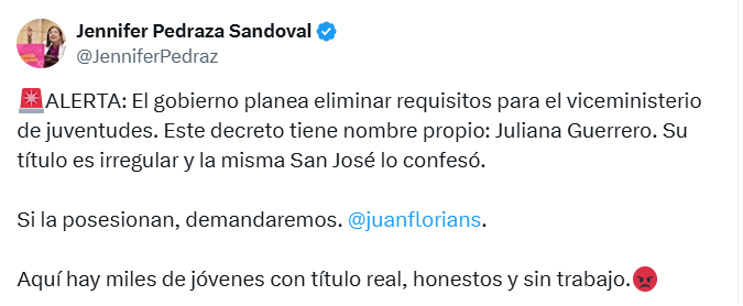 “El Gobierno planea eliminar requisitos para el viceministerio de Juventudes. Este decreto tiene nombre propio: Juliana Guerrero. Su título es irregular y la misma universidad lo confesó”, afirmó la congresista, quien advirtió que emprenderá acciones jurídicas si el nombramiento se concreta.