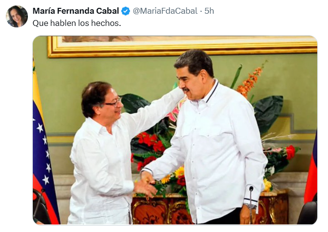 Minutos después, Cabal compartió una fotografía en la que Petro aparece estrechando la mano de Maduro durante una visita oficial a Caracas, buscando reforzar su acusación sobre una supuesta cercanía política y personal entre ambos mandatarios.