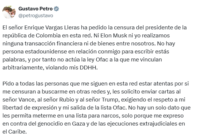 La reacción del mandatario surgió luego de que el empresario Enrique Vargas Lleras solicitara públicamente a Elon Musk restringir la cuenta de X del jefe de Estado colombiano, alegando que su condición en la lista lo inhabilita para operar libremente en plataformas estadounidenses.