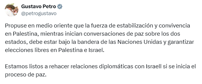 “Estamos listos a rehacer relaciones diplomáticas con Israel si se inicia el proceso de paz”, expresó el mandatario a través de su cuenta en la red social X, en un mensaje que coincide con el anuncio del presidente de Estados Unidos, Donald Trump, sobre el posible despliegue de una fuerza internacional de estabilización en Gaza.