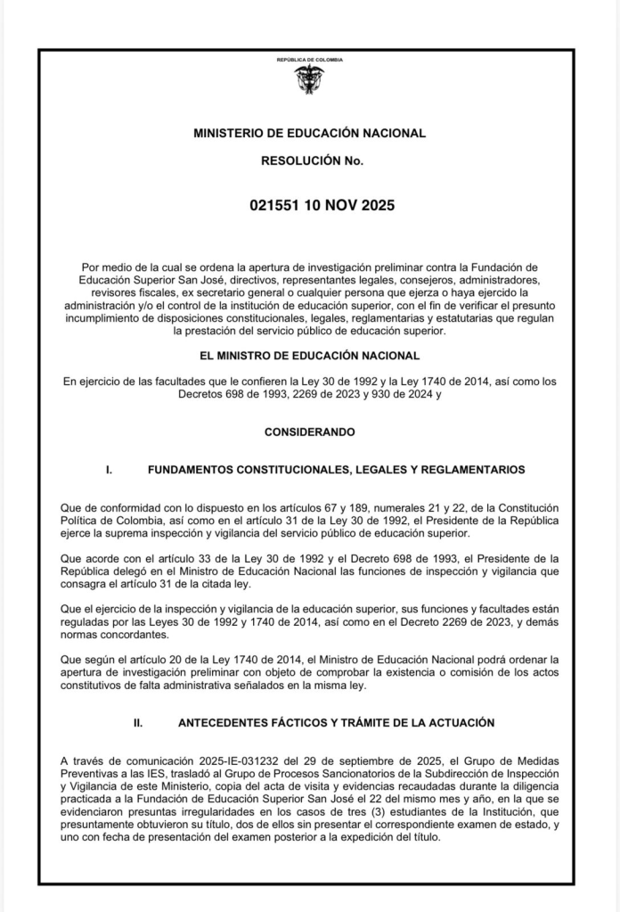 El Ministerio de Educación Nacional abrió una investigación formal contra la Fundación Universitaria San José, luego de detectar presuntas irregularidades en la expedición de títulos de educación superior sin el cumplimiento de los requisitos legales. Entre los casos señalados se encuentra el de Juliana Guerrero, exfuncionaria del Ministerio del Interior que fue postulada para la Viceministerio de Juventud.