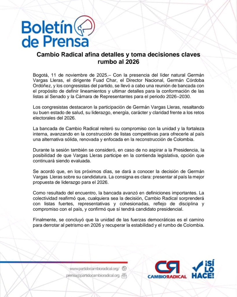 La Registraduría fijó el 8 de diciembre como la fecha límite para la inscripción de candidaturas, lo que deja pocas semanas para que Cambio Radical y su líder natural definan su papel en la contienda de 2026. Por ahora, Vargas Lleras mantiene el suspenso y el partido espera su decisión.