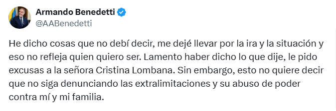 Tras varios días de tensión y ataques en redes sociales, Benedetti publicó un mensaje en el que pidió disculpas públicas a la magistrada, admitiendo que se dejó llevar por la ira. “He dicho cosas que no debí decir, me dejé llevar por la ira y la situación, y eso no refleja quién quiero ser. Lamento haber dicho lo que dije, le pido excusas a la señora Cristina Lombana”, escribió el funcionario en su cuenta de X.