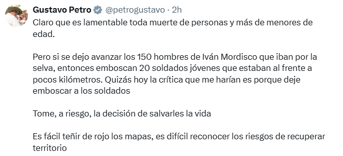 El mandatario respondió a las críticas que surgieron tras conocerse el resultado de la operación, defendiendo que su decisión buscaba evitar una emboscada contra tropas del Ejército. Según explicó, si los 150 hombres de Iván Mordisco continuaban su avance, existía un riesgo inminente para un grupo de 20 soldados ubicados a pocos kilómetros. “Quizás hoy la crítica que me harían es porque dejé emboscar a los soldados”, sostuvo.