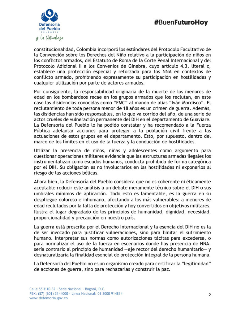 La Defensoría insistió en que su función no es validar acciones de guerra, sino promover el principio de humanidad. Subrayó que el DIH prohíbe categóricamente el uso de menores como escudos humanos y señaló que el análisis no puede limitarse a una discusión técnica sobre los umbrales de la norma, pues su esencia es “reducir el sufrimiento humano”.