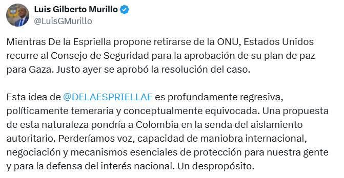 El excanciller y precandidato presidencial Luis Gilberto Murillo, reaccionó fuertemente a la propuesta del también aspirante presidencial, Abelardo de la Espriella, quien planteó que Colombia debería retirarse de la ONU, de la OEA y el CIDH, calificándola como una iniciativa «profundamente regresiva», con riesgos evidentes para la política exterior nacional.