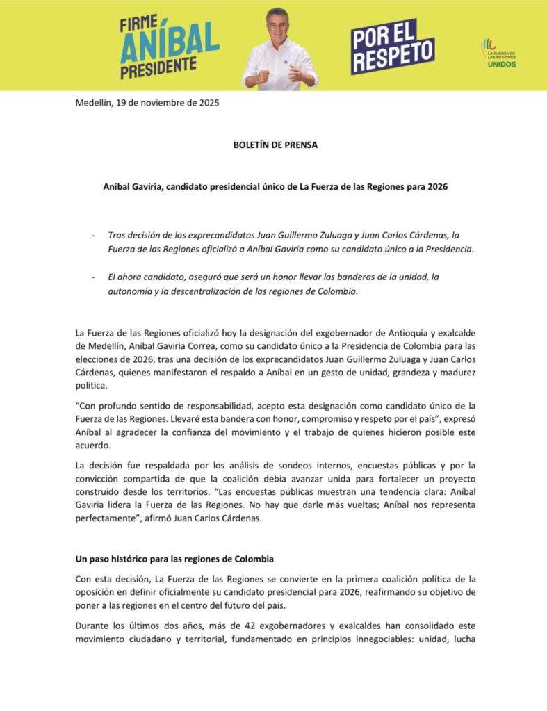 La coalición La Fuerza de las Regiones oficializó este miércoles a Aníbal Gaviria como su candidato presidencial único para las elecciones de 2026, luego de que Juan Guillermo Zuluaga y Juan Carlos Cárdenas retiraran sus aspiraciones y anunciaran públicamente su respaldo al exgobernador de Antioquia.