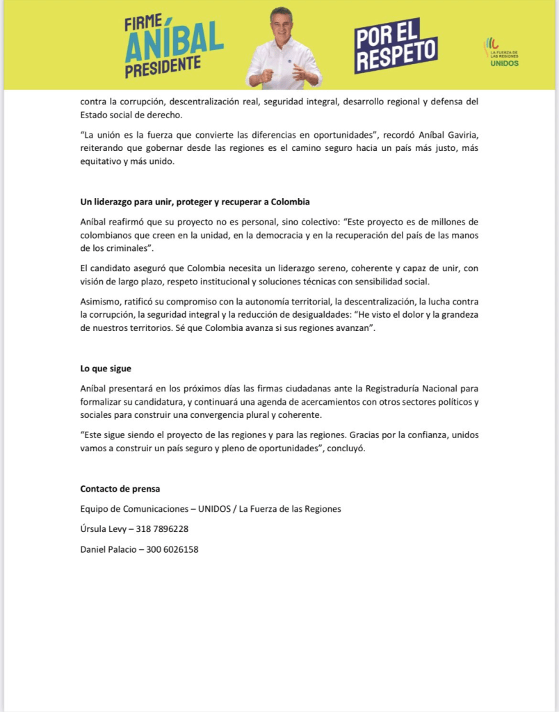 De esta manera, la Fuerza de las Regiones se alista para participar en la consulta de la derecha y la centroderecha prevista para el 8 de marzo de 2026, donde Gaviria competirá por un cupo definitivo en la carrera hacia la Casa de Nariño.