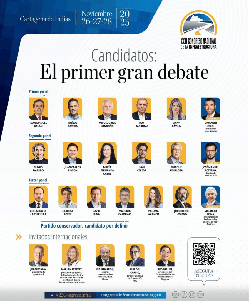 En el marco del XXII Congreso Nacional de la Infraestructura, que se realizará en Cartagena del 26 al 28 de noviembre de 2025, se llevará a cabo un debate entre precandidatos presidenciales enfocado en los retos y oportunidades del desarrollo de infraestructura en Colombia. Este espacio, organizado por la Cámara Colombiana de la Infraestructura, es reconocido como uno de los principales escenarios de articulación entre los sectores público y privado para definir prioridades, examinar estrategias y discutir soluciones técnicas, políticas y financieras sobre el futuro del sector.