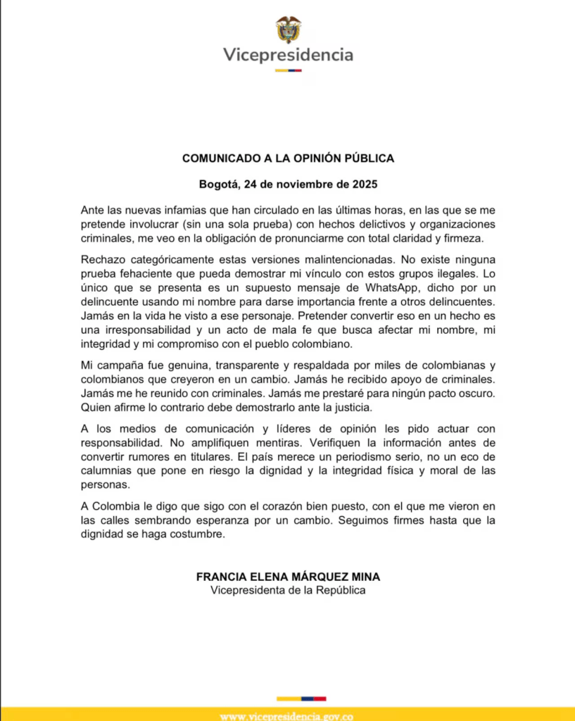 La vicepresidenta Francia Márquez rechazó de manera enérgica las acusaciones de que habría servido de intermediaria en supuestos acuerdos entre disidencias de las Farc y la campaña presidencial de 2022, tras la difusión de chats atribuidos a integrantes de esos grupos. Márquez calificó las versiones como “nuevas infamias” y exigió que quien afirma lo contrario presente pruebas ante la justicia.