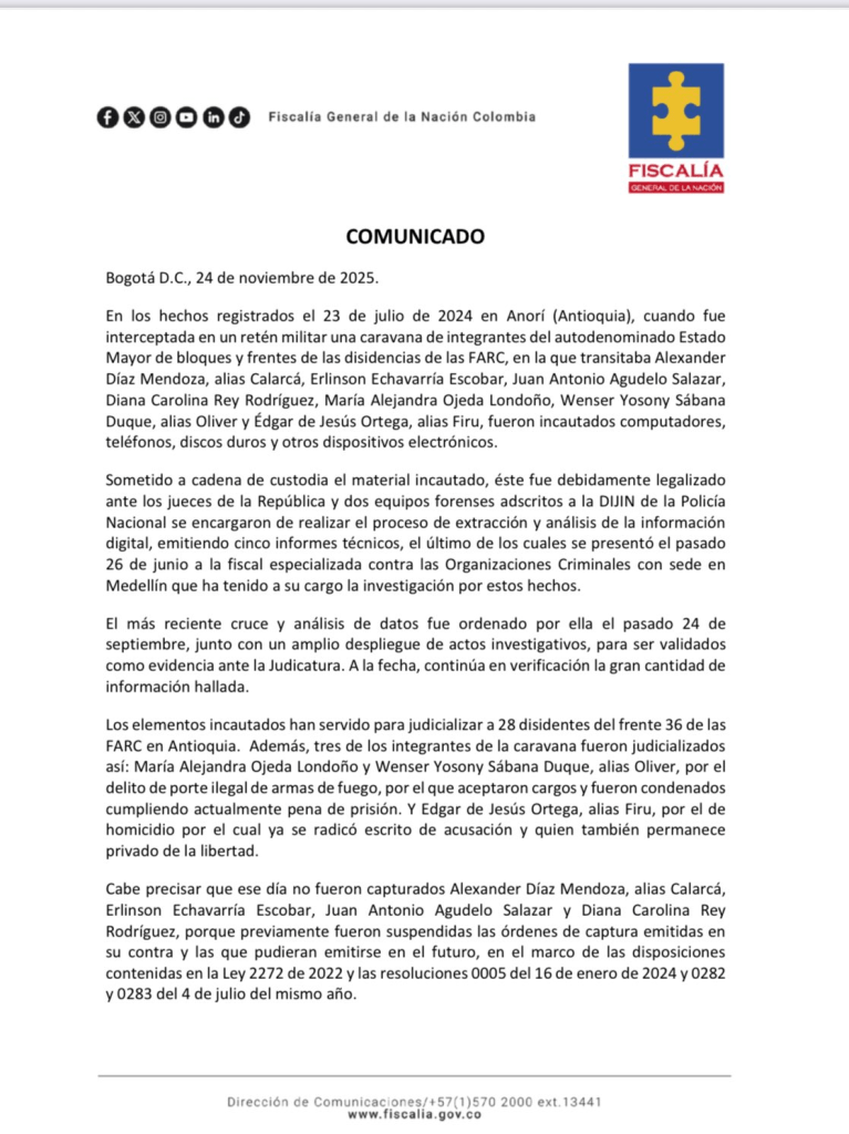 La Fiscalía sostuvo que, desde la incautación, una delegada en Medellín ha avanzado de forma autónoma en un proceso que ya dejó 28 disidentes judicializados, incluidos integrantes del frente 36. Sin embargo, Camargo afirmó que su despacho no recibió información completa sobre el material revelado por los medios y ordenó reorientar la investigación para verificar su autenticidad, su origen y su eventual conexión con agentes estatales.