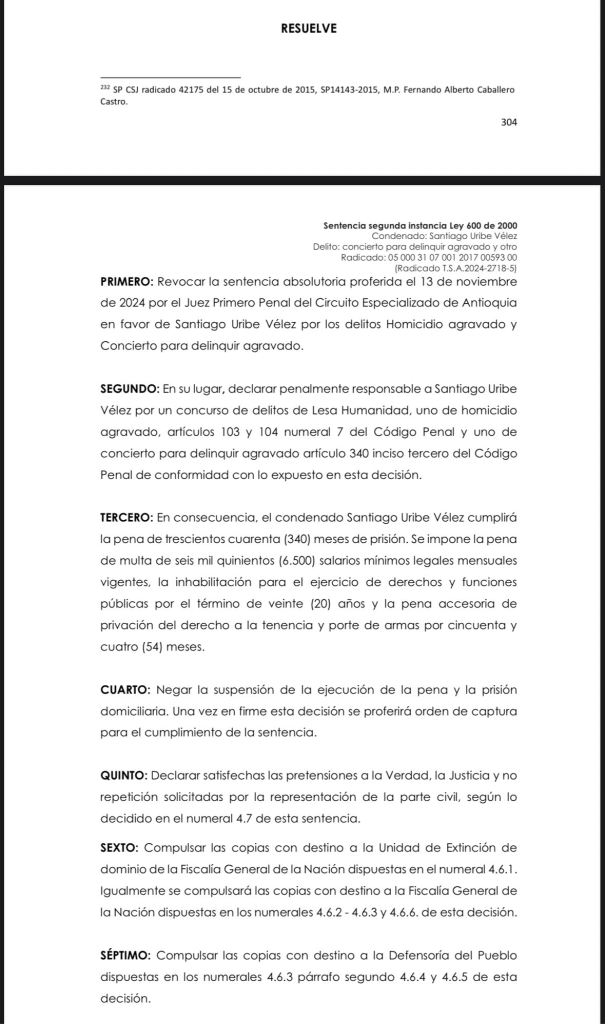 El fallo también establece una multa de 6.500 salarios mínimos y niega cualquier beneficio de suspensión de la pena o prisión domiciliaria. Una vez la Corte Suprema se pronuncie, si ratifica la condena, se emitirá orden de captura inmediata.
