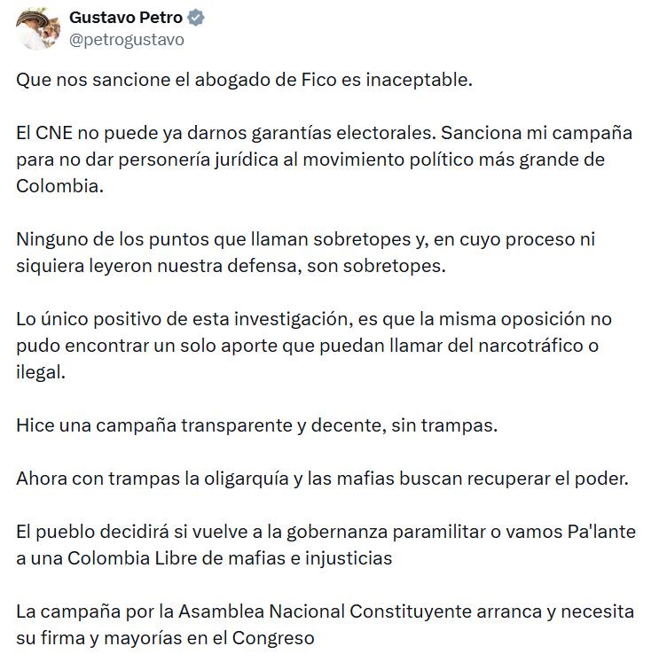 “El CNE sanciona mi campaña para no dar personería jurídica al movimiento político más grande de Colombia. Lo único positivo de esta investigación, es que la oposición no pudo encontrar un solo aporte ilegal”, escribió el mandatario.