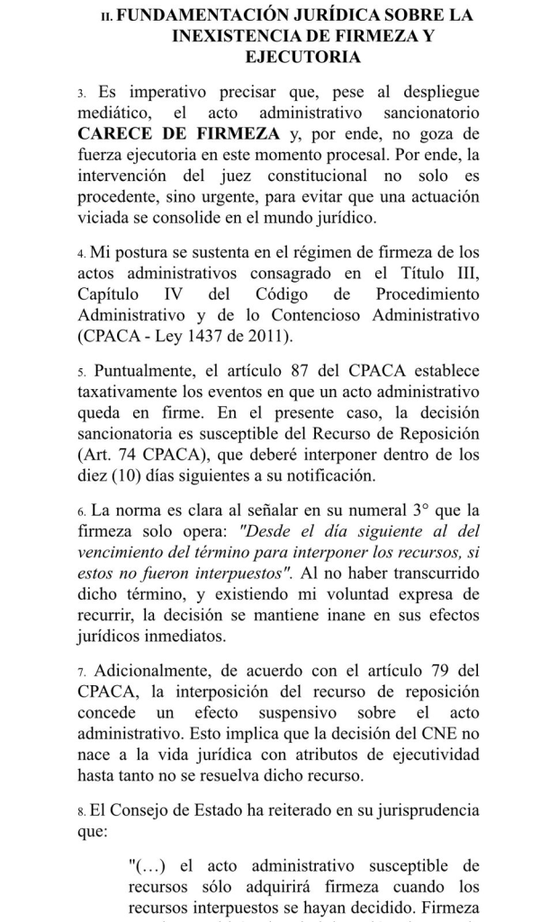 La tutela fue presentada inicialmente el 19 de noviembre, antes de que se conociera la resolución final del organismo electoral. Distintos medios revelaron que Roa anexó un documento adicional en el que reitera que el proceso vulneró su derecho al debido proceso y a la defensa técnica. Según el directivo, el CNE falló con base en un acervo probatorio incompleto y sin practicar pruebas que la misma entidad había considerado pertinentes.