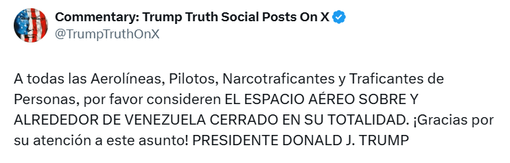El presidente de Estados Unidos, Donald Trump, pidió este jueves a aerolíneas y pilotos abstenerse de volar sobre Venezuela, en una nueva señal del aumento de fricciones entre Washington y el gobierno de Nicolás Maduro. El mandatario afirmó que el espacio aéreo venezolano debe considerarse “cerrado por completo”.