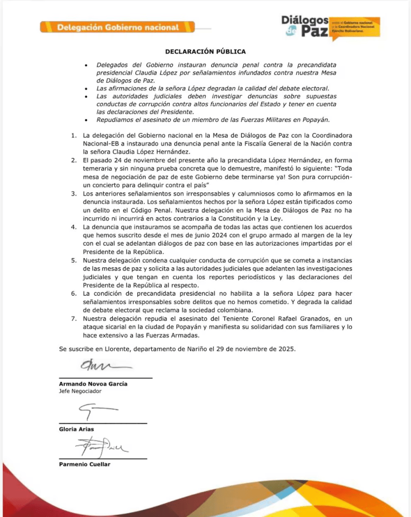 El pronunciamiento, firmado en Llorente, Nariño, el pasado 29 de noviembre, sostiene que las afirmaciones de López constituyen señalamientos “irresponsables y calumniosos” que afectan a funcionarios autorizados para conducir el proceso de paz vigente desde junio de 2024.