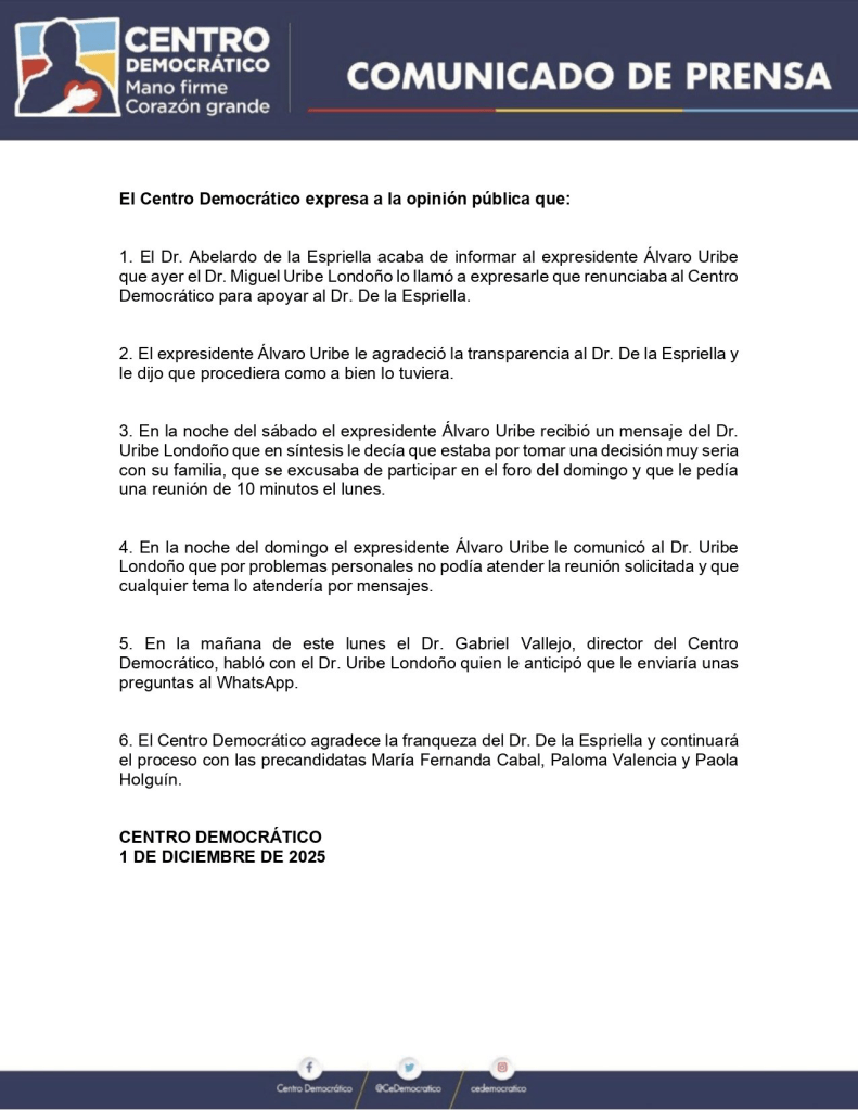 Según un comunicado de seis puntos emitido por el partido, el expresidente Álvaro Uribe recibió el sábado una llamada del precandidato Abelardo de la Espriella, quien afirmó haber sido informado directamente por Uribe Londoño sobre su decisión de retirarse de la contienda y adherirse a su campaña. Esa versión contrastó de inmediato con la postura del propio Uribe Londoño, quien insistió en que nunca ha comunicado dicha renuncia.