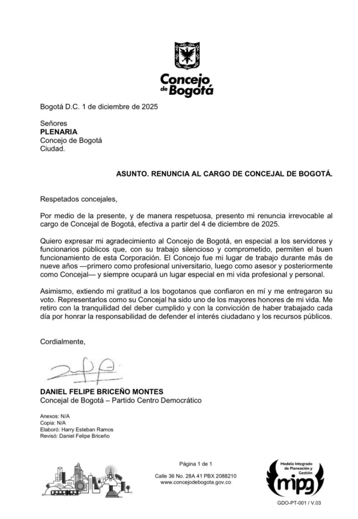 En la carta presentada ante la secretaría de la corporación, Briceño anunció: “Por medio de la presente, y de manera respetuosa, presento mi renuncia irrevocable al cargo de Concejal de Bogotá, efectiva a partir del 4 de diciembre de 2025”. La decisión marca su salida luego de más de nueve años de trayectoria en el Concejo, primero como profesional universitario, luego como asesor y finalmente como concejal electo.