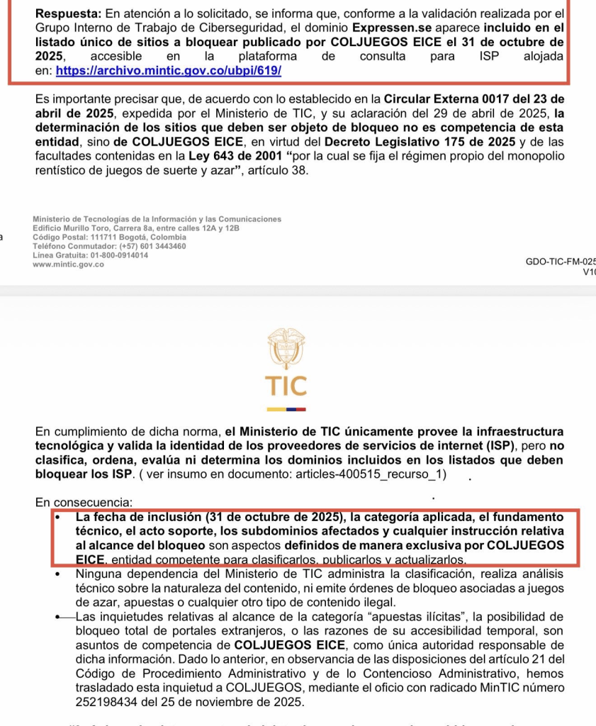 En su respuesta, el MinTIC señaló que el dominio Expressen.se figura en el listado único de sitios a bloquear elaborado por Coljuegos y publicado el 31 de octubre de 2025. Según la entidad, los registros técnicos fueron verificados por el Grupo Interno de Trabajo de Ciberseguridad, que confirmó la presencia del medio en el directorio de páginas restringidas.