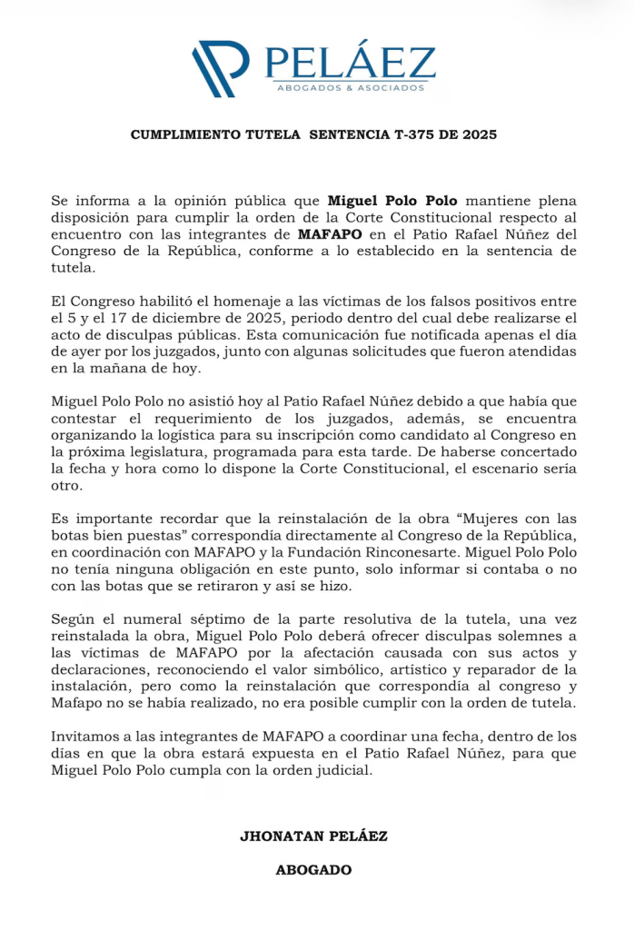 Horas después del fallido acto, la oficina de Polo Polo publicó un comunicado argumentando que su ausencia se debió a motivos administrativos y de agenda. Según el documento, el congresista debía responder requerimientos judiciales notificados el día anterior y adelantar trámites relacionados con su inscripción como candidato al Congreso, prevista para la misma tarde.