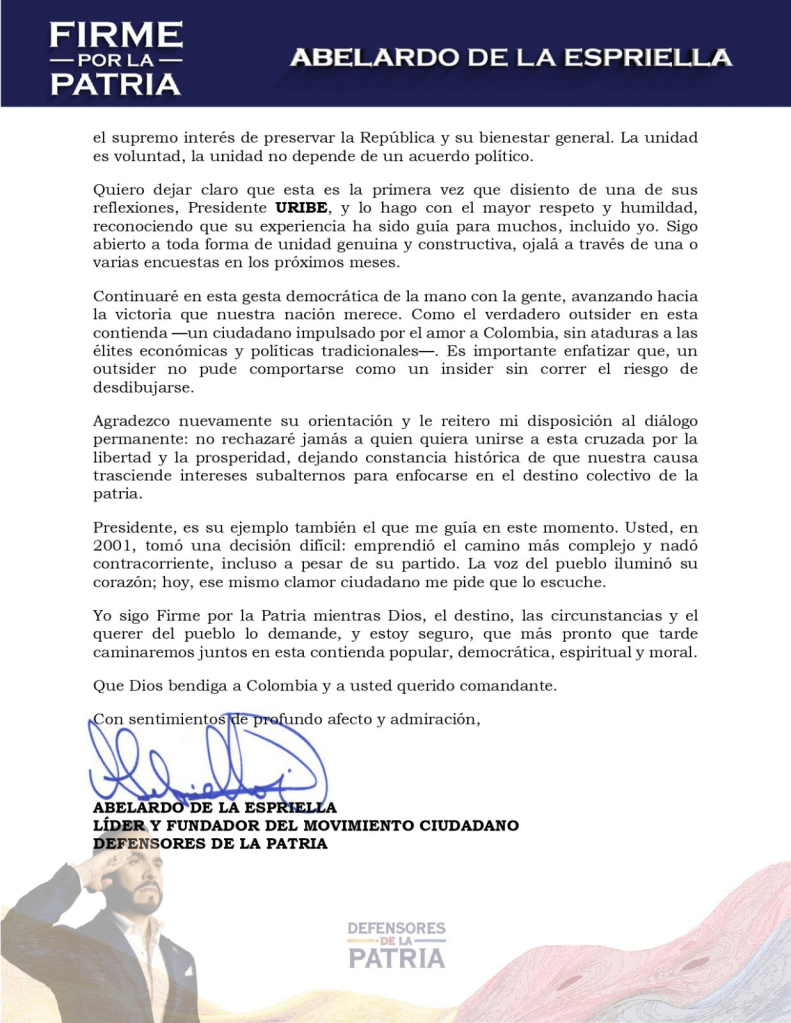 En la carta, De la Espriella remarcó que no tiene diferencias personales con Uribe, a quien expresó afecto y admiración, y aclaró que se trata de su primera discrepancia pública con el expresidente. También afirmó que no ve adversarios dentro de la derecha y que sus únicos opositores son el presidente Gustavo Petro, el senador Iván Cepeda y quienes, según él, respaldan el proyecto político del actual Gobierno.