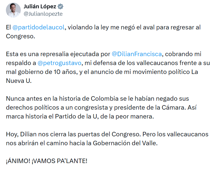 En su mensaje publicado en redes sociales, López sostuvo: “El Partido de la U, violando la ley, me negó el aval para regresar al Congreso. Esta es una represalia ejecutada por Dilian Francisca Toro (…) Nunca antes en la historia de Colombia se le habían negado sus derechos políticos a un congresista y presidente de la Cámara”.