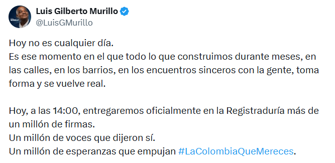 En la primera semana de diciembre, Luis Gilberto Murillo confirmó que el millón de firmas ya había sido validado por su equipo interno, y que continuarían recorriendo zonas urbanas y rurales para ampliar el respaldo. La meta de 1,2 millones se cumplió en cuestión de días, tras una recta final marcada por visitas a comunas en Cali, encuentros con organizaciones étnicas del Pacífico y caminatas barriales en municipios del Caribe.