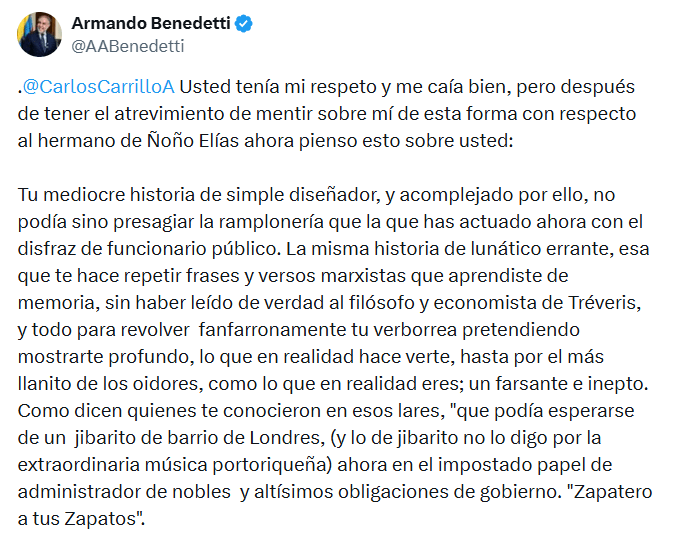 En otro mensaje, el ministro elevó el tono de su crítica y lanzó un ataque directo contra el perfil profesional de Carrillo. “Tu mediocre historia de simple diseñador, y acomplejado por ello, no podía sino presagiar la ramplonería con la que has actuado ahora con el disfraz de funcionario público”, afirmó Benedetti, quien también cuestionó la solvencia técnica del funcionario y lo instó a responder por los señalamientos en su contra.