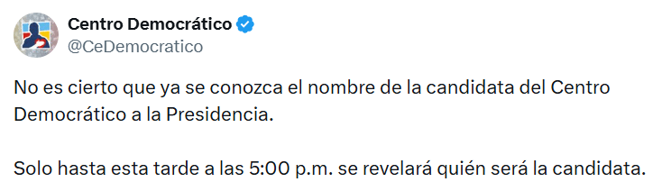 Sin embargo, desde el Centro Democrático buscaron bajar la temperatura y reiteraron que no existe aún una decisión oficial. A través de su cuenta institucional en X, el partido aseguró que el nombre de la candidata presidencial se dará a conocer este lunes a las 5:00 de la tarde, tal como fue anunciado previamente.
