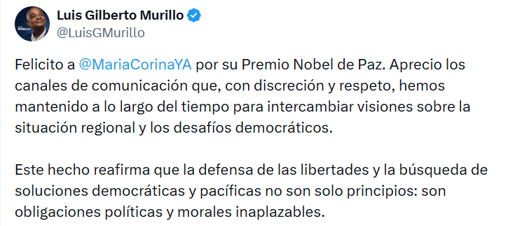 Murillo, quien fue canciller durante el gobierno de Gustavo Petro en una etapa compleja de la relación entre Colombia, Venezuela y Estados Unidos, publicó el mensaje a través de su cuenta de X, en el que destacó la importancia de la defensa de las libertades, y de las salidas democráticas y pacíficas a las crisis políticas. En el mismo mensaje señaló que ha mantenido, a lo largo del tiempo, canales de comunicación con Machado para intercambiar visiones sobre la situación regional.