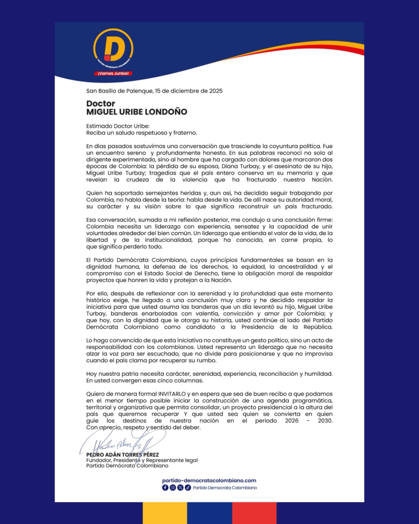 El Partido Demócrata Colombiano le propuso formalmente a Miguel Uribe Londoño asumir su candidatura presidencial para las elecciones de 2026, en una movida que reabre el panorama político de cara a la próxima contienda electoral. La invitación fue hecha a través de una carta firmada por Pedro Adán Torres Pérez, fundador y presidente de la colectividad, en la que se plantea el respaldo del partido a una eventual aspiración presidencial.
