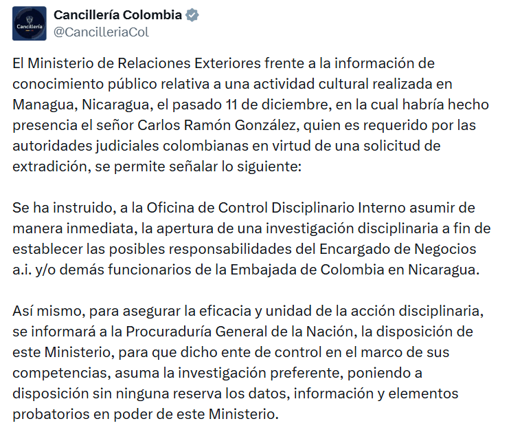 La Cancillería ordenó la apertura de una investigación disciplinaria interna para establecer si hubo responsabilidades de funcionarios de la Embajada de Colombia en Nicaragua en la participación de Carlos Ramón González en una fiesta realizada en Managua el pasado 11 de diciembre.