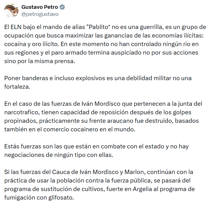 En el mismo pronunciamiento, Petro también se refirió al ELN, especialmente a frentes bajo el mando de alias ‘Pablito’, al asegurar que no se trata de una guerrilla con dominio territorial, sino de un grupo enfocado en actividades ilegales como el narcotráfico y la minería ilícita. Agregó que acciones como la instalación de banderas o explosivos buscan generar temor, pero evidencian debilidad militar.
