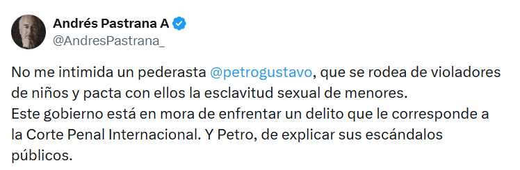 “No me intimida un pederasta @petrogustavo, que se rodea de violadores de niños y pacta con ellos la esclavitud sexual de menores”, escribió. Además, sostuvo que el Gobierno “está en mora de enfrentar un delito que le corresponde a la Corte Penal Internacional” y afirmó que el presidente debe explicar “sus escándalos públicos”.