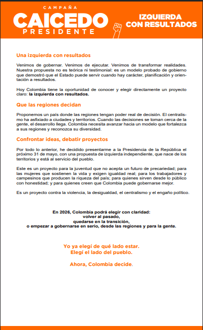 Caicedo reiteró que su apuesta es llegar directamente a la primera vuelta presidencial del 31 de mayo de 2026, respaldado por cerca de 2,6 millones de firmas ciudadanas que avalaron su aspiración. Con ello, se consolida como una candidatura independiente dentro del espectro progresista, pero distante del actual Gobierno.