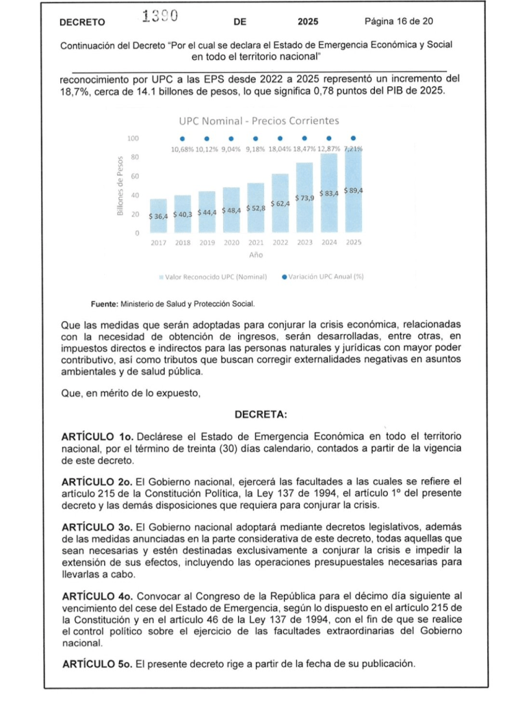 Según el documento, la declaratoria responde a la imposibilidad de cubrir compromisos considerados no recortables dentro del presupuesto, entre ellos el pago de la Unidad de Pago por Capitación (UPC) en el sistema de salud y otras obligaciones del Estado. El Ejecutivo sostiene que la no aprobación de la reforma tributaria agravó el déficit y limitó las herramientas ordinarias para garantizar la prestación de servicios esenciales.