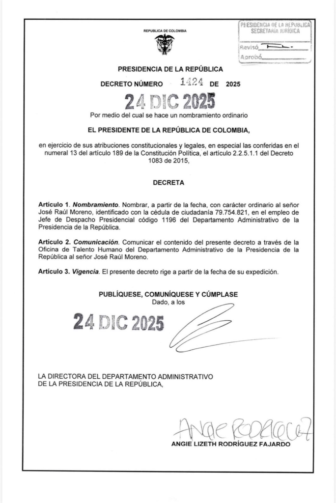 La Presidencia de la República oficializó la ratificación de José Raúl Moreno como jefe de despacho del presidente Gustavo Petro, un movimiento que ya se daba por descontado tras la publicación previa de su hoja de vida en la plataforma de Aspirantes de la Casa de Nariño.